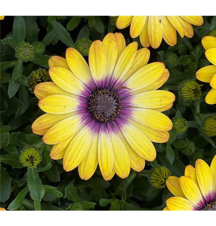 Osteospermum 'Erato® Yellow Purple Eye' bildet während der gesamten Saison zahlreiche in Körbchen angeordnete, pink-gelbe Blüten.