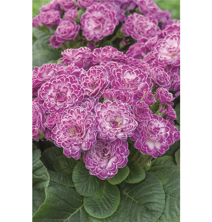Primula vulgaris 'Candy Frost' bildet gefüllte, lila-weiße Blüten ab März. Diese werden etwa 2,5 - 3,5 cm groß.