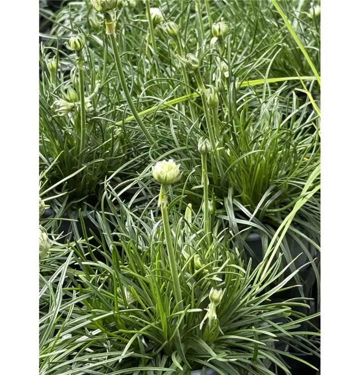 Armeria maritima, weiß mit rosa Touch, bildet ballförmige, pinke Blüten ab Mai.