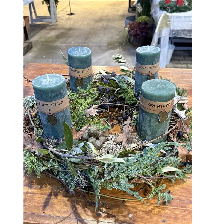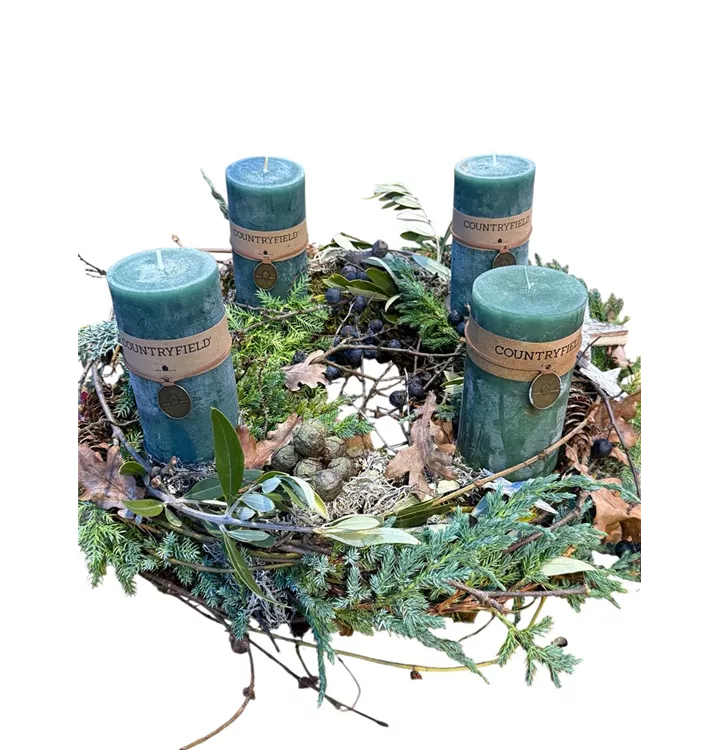 Der Adventskranz „Piniengrün – Natur Edition“ verbindet die Ruhe des Waldes mit zeitloser Eleganz. Feines Moos, frisches Wintergrün, filigrane Zweige, Beeren, Zapfen und ausgewählte Naturfundstücke verschmelzen zu einem harmonischen Arrangement. Im Zentrum stehen vier hochwertige Countryfield-Stumpenkerzen in tiefem Piniengrün, die dem Kranz seine warme, erdige Ausstrahlung verleihen.