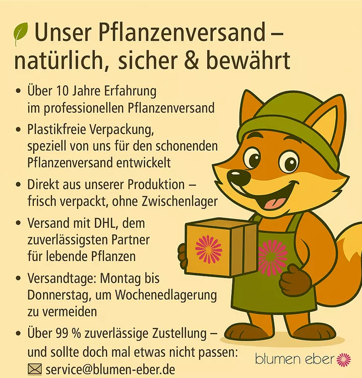 Sie erhalten eine ausgewachsene Pflanze aus unserer eigenen Gärtnerei. Pflanzen sind ein Naturprodukt, Blatt- und Blütenstadium sowie Blatt- und Blütenfarbe sind von Jahreszeit und Wachstumsstadium abhängig und können sich von dem angezeigten Bild unterscheiden. Zierpflanze, nicht zum Verzehr geeignet.