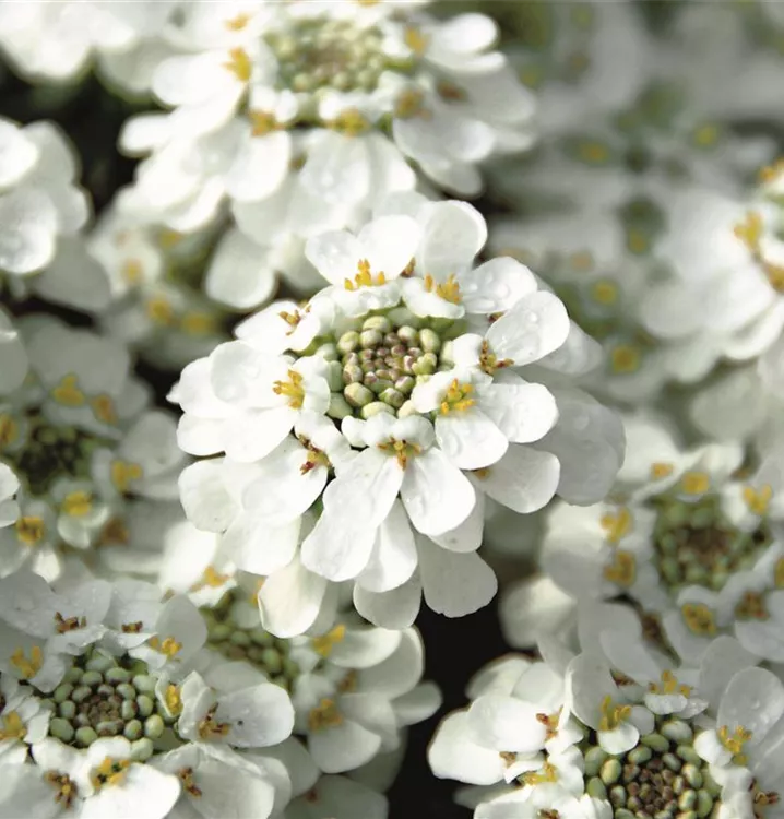 Iberis sempervirens 'Snowball' bildet in Dolden angeordnete, weiße Blüten ab April. Diese werden etwa 3 - 4 cm groß.
