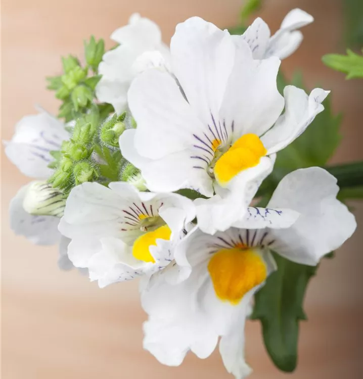Nemesia SUNSATIA™ weiß bildet während der gesamten Saison zahlreiche lippenförmige, in Trauben angeordnete, weiße, rosafarbene, rote, gelbe, blaue, lilafarbene Blüten.