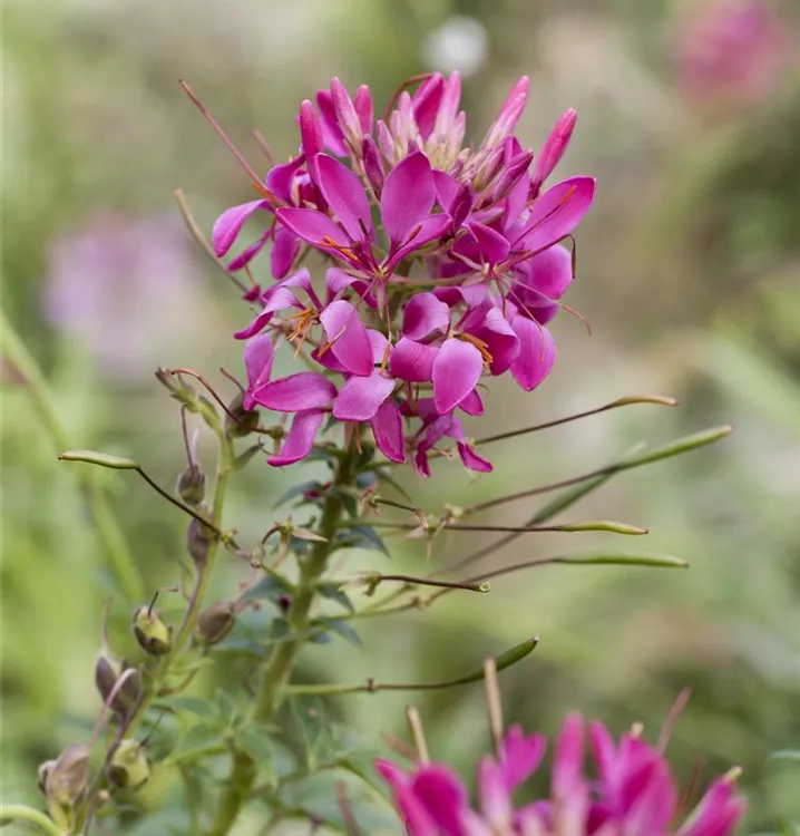 Cleome spinosa 'Sparkler Rose' bildet während der gesamten Saison zahlreiche rosafarbene Blüten. Diese verströmen einen angenehmen Duft.