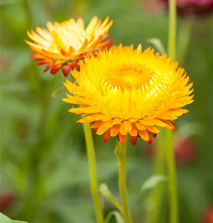 Die Strohblume verzaubert durch ihre zahlreichen leuchtend orangegelben Blüten, die die ganze Saison hindurch erscheinen.Die Blüten sind körbchenartig.