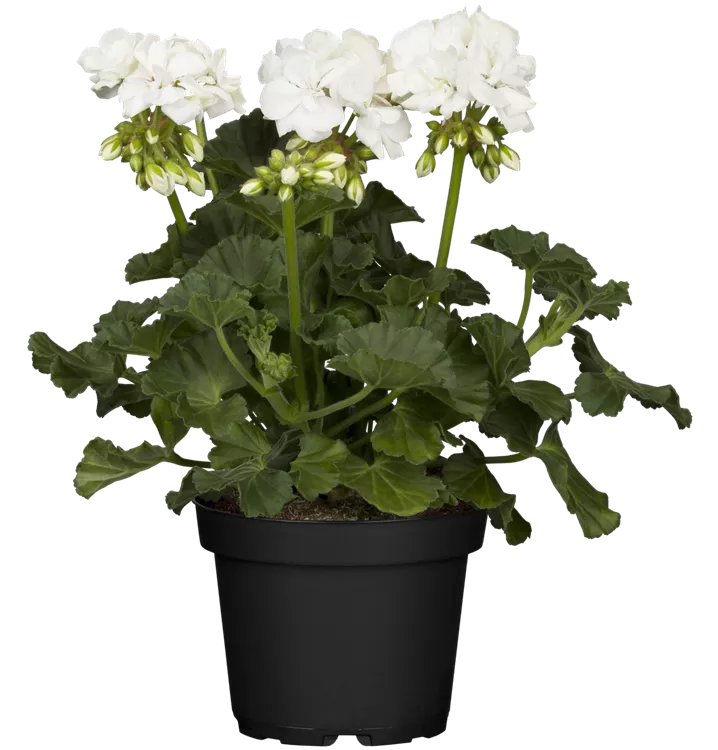 Pelargonium zonale 'Isabella' bildet während der gesamten Saison zahlreiche gefüllte, weiße Blüten.