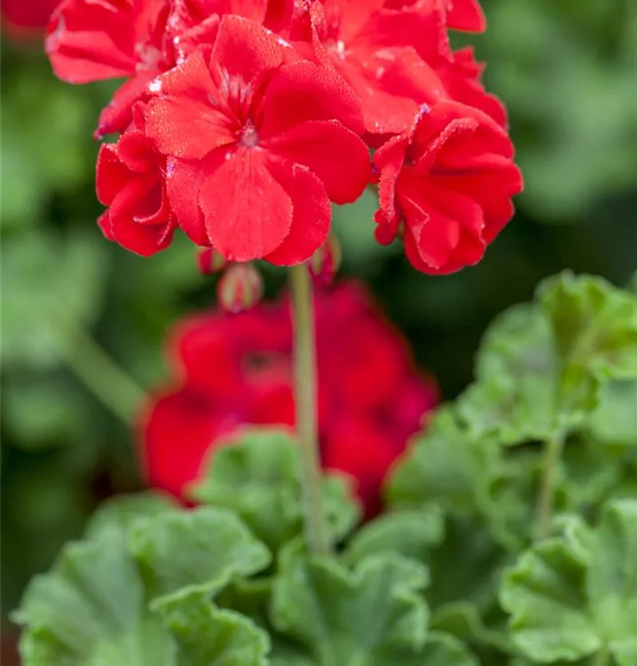 Pelargonium zonale 'Carlos' bildet während der gesamten Saison zahlreiche leuchtend rote Blüten.