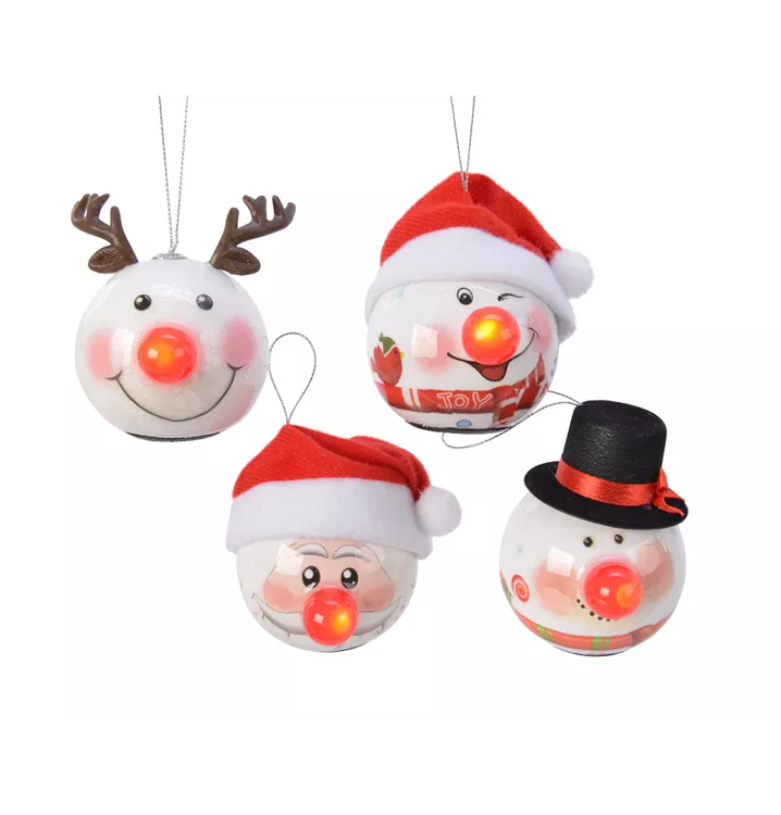Weihnachtskugel oder Christbaumkugel in 4 verschiedenen Varianten mit roter LED blinkenden Nase. In den wunderschönen Designs Elch, Weihnachtsmann, Schneemann mit Weihnachtsmütze und Schneemann mit Zylinder. Die Kugel hat einen Schlaufe zum aufhängen. Durchmesser 6,5 cm in Kunststoff bemalt und zum teil mit Dekoelementen beklebt. Batterieversorgung oder Knopfzelle. Die Knopfzelle ist im Lieferumfang inbegriffen. Die Beleuchtung ist durch einen Schalter ein- und ausschaltbar.