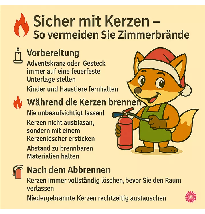 Zur Vermeidung von Zimmerbränden in der Advents- und Weihnachtszeit bitten wir um Beachtung folgender Sicherheitsmaßnahmen: