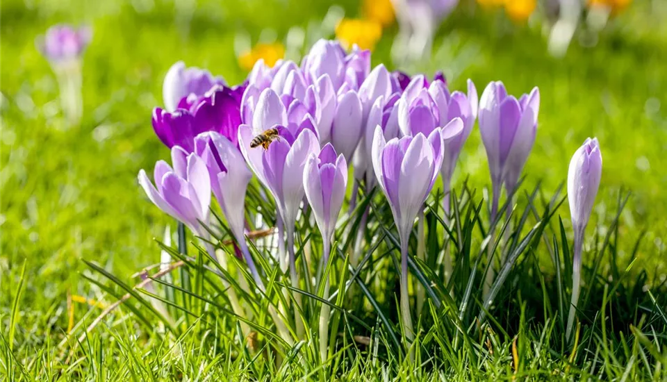 Möchten Sie möglichst frühzeitig wieder Farbe in den Garten bringen, sind Krokusse und Schneeglöckchen eine gute Wahl. Sie sehen auch auf einem Rasen gut aus. Wenn Sie Blumenzwiebeln in Grünflächen setzen, sollten Sie den Rasen jedoch nicht zu früh mähen, denn Zwiebelblumen sammeln über ihre Blätter Nährstoffe für das folgende Jahr.