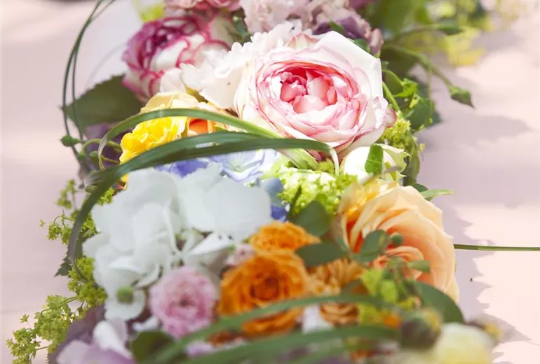 Die Blumendeko auf dem Tisch wird meist dem Brautstrauß angeglichen. Wichtig bei der Auswahl: Die Blumenarrangements sollten keinesfalls zu hoch sein. Denn die sich an der Tafel gegenüber sitzenden Gäste müssen sich noch sehen können. Auch wird die Blumendeko meist länglich oder insgesamt nicht zu üppig gestaltet, denn sie soll nicht weichen müssen, damit Speisen und Getränke Platz finden.
