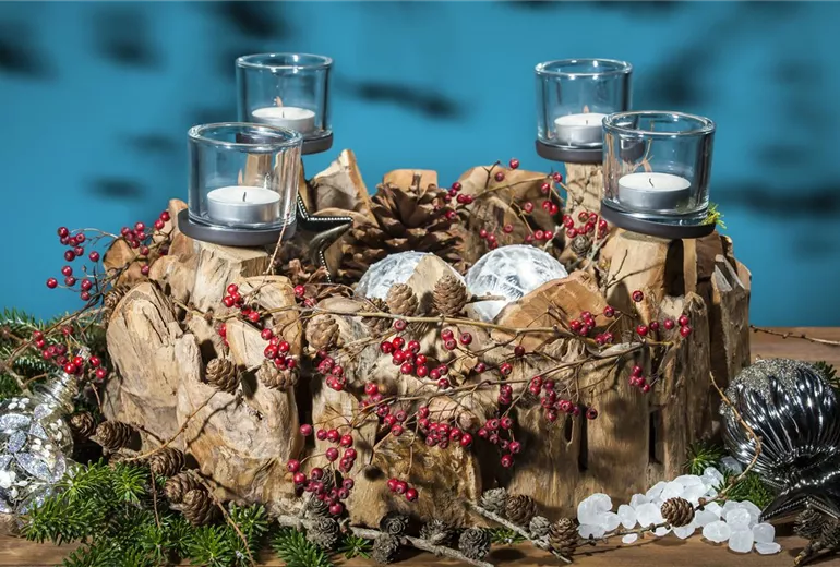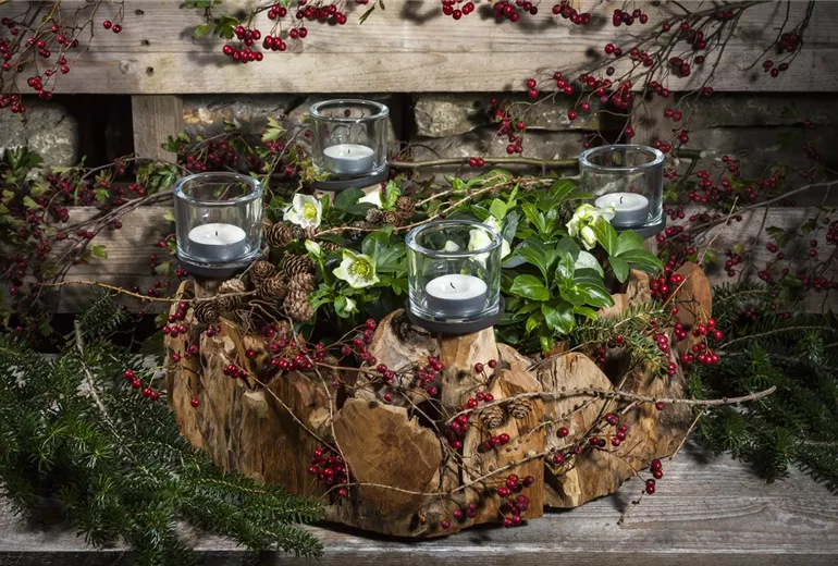 Alles schön und gut, mag mancher Blumenliebhaber nun denken, aber gibt es denn auch einen Adventskranz mit richtigen Blüten? Oh ja! Stellen Sie vier Kerzen in die Mitte einer Kork- oder Holzplatte und umringen Sie sie mit dem getrockneten Flor der fantastischen Hortensie. Dazu folgender Tipp: Kappen Sie die Stängel mehrere Zentimeter unterhalb der Blüte schräg ab und entfernen Sie die Blätter. Dann geben Sie sie in ein Gemisch aus einem Teil Glyzerin und drei Teilen Wasser. Nun lassen Sie das Wasser verdunsten. Automatisch geht dann das Glyzerin in die Blütenpracht über und konserviert sie. Die Farbenpracht bleibt erhalten! Falls Sie diese effektvolle Pflanze noch nicht in Ihrem Garten haben – das können Sie ja nachholen.