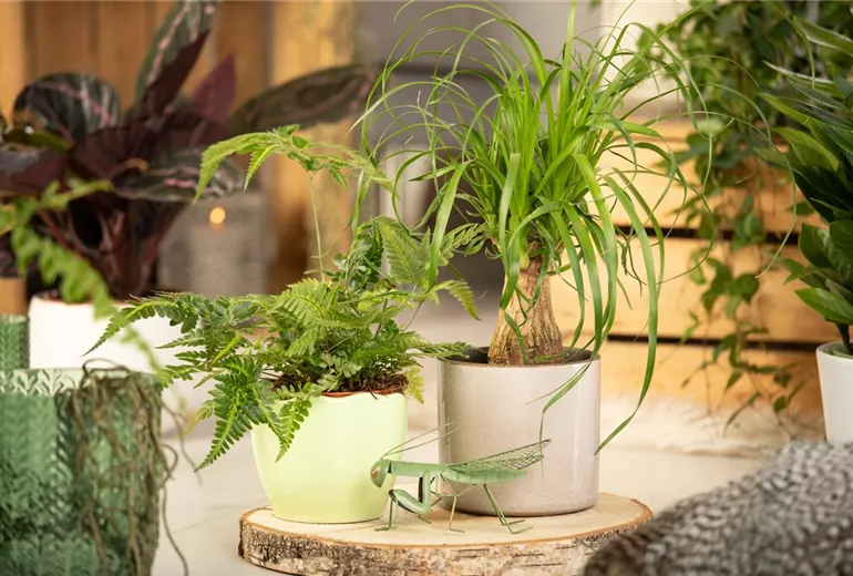 Besonders beliebt sind bei der Vielfalt der Zimmerpflanzen Grünpflanzen, die mit ihren besonderen Blättern für kleine Highlights im Haus sorgen. Besonders gut kann man sich mit diesen Kandidaten einen eigenen kleinen Dschungel schaffen. Allen voran passt da die Korbmarante gut ins Spiel. In den unterschiedlichsten Farben, Mustern und Formen kommen ihre Blätter daher und die Tropenpflanze fühlt sich mit der passenden Pflege in unseren vier Wänden richtig wohl. Der Elefantenfuß hat nicht nur besonders lange Blätter zu bieten, sondern auch einen beeindruckenden Stamm, dem die Pflanze ihren Namen verdankt. Denn der nach unten dicker werdende Stamm der Pflanze sieht wirklich fast so aus, wie der Fuß der beliebten Dickhäuter. Und weil die Vielfalt der Zimmerpflanzen so groß ist, gibt es neben Glücksfeder, Ufopflanze, Monstera und Co. noch unendlich viele weitere Grünpflanzen, die im eigenen Zuhause eine richtig gute Figur machen.
