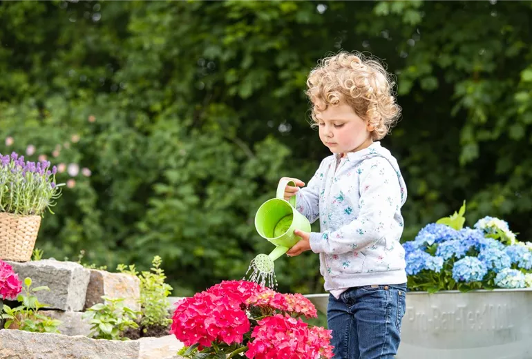 Wichtig beim Hortensien pflegen ist der passende Standort mit möglichst idealen Bodenbedingungen. Denn nur dann bedankt sich die Hortensie mit einem wogendem Meer aus großen Blüten. Die pralle Sonne ist nicht für alle Sorten optimal, viele Hortensien bevorzugen den Halbschatten. Der Boden sollte humusreich und mit einem pH-Wert von etwa 5,5 leicht sauer sein. Ebenso ausschlaggebend wie der passende Standort und der richtige Boden ist das ausreichende Gießen. Denn wer Hortensien pflegen möchte, sollte unbedingt ihren großen Wasserbedarf kennen und dafür sorgen, dass der Boden niemals gänzlich austrocknet. Staunässe ist zwar auch für die Hortensien eher schädlich, aber bei Trockenheit und längeren Dürreperioden leiden Hortensien oft ganz besonders.