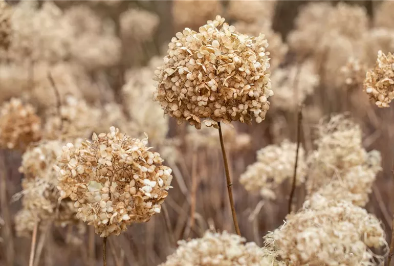 Hortensien, die im Hortensienbeet gehalten werden, sind meist bedingt winterhart. Denn Hortensien gehören zu den Halbsträuchern und verholzen lediglich an der Basis ihrer Triebe aus dem aktuellen Jahr. Die Triebspitzen jedoch, die schon Ansätze für die Knospen im kommenden Jahr aufweisen, können deshalb bei zu starkem Frost erfrieren. In Regionen mit eher kälteren Wintern empfiehlt sich deshalb unbedingt ein geeigneter Winterschutz. Sonst könnte in einem ganz besonders kalten Winter leicht die ganze Blütenpracht erfrieren. Am besten ist es jedoch bei empfindlichen Sorten, die Hortensien im frostfreien Winterquartier überwintern zu lassen, um auch im Winter die Hortensien pflegen und hegen zu können. Ein unbeheiztes Gewächshaus ist hierfür ideal, aber auch ein unbeheizter, nicht zu heller Raum eignet sich dafür.